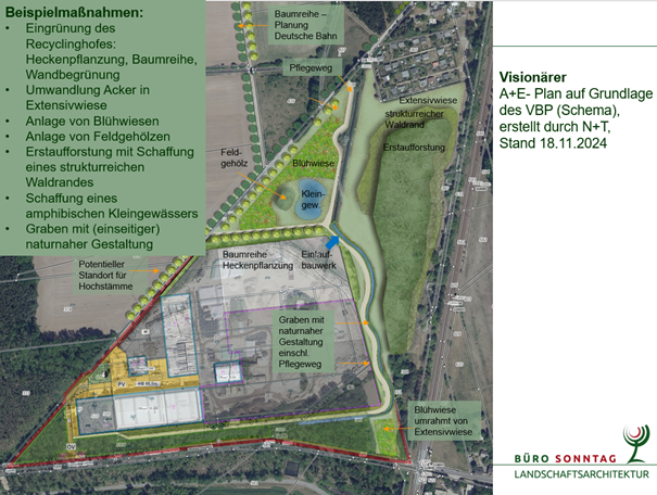 Der zurzeit verrohrte Graben auf dem Gelände des Recyclingzentrums soll an der östlichen Grundstücksgrenze als offener Graben ausgeführt werden. Der Löschwasserteich auf dem Gelände wird perspektivisch nicht benötigt und soll als Amphibienteich verlegt werden und in die Ausgleichs- und Ersatzmaßnahmen einfließen. Ziel dieser Maßnahmen ist eine Bewässerung der angrenzenden Flächen zu ermöglichen und der Flora und Fauna eine Ansiedlungsmöglichkeit zu geben.